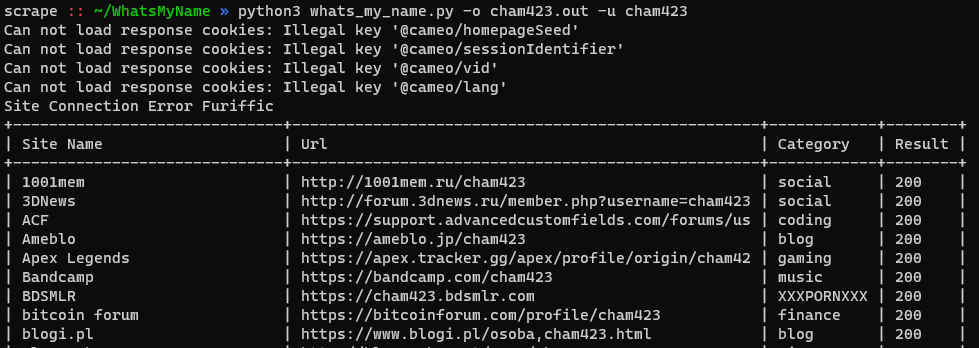 python3 whats_my_name.py -u cham423 -o cham423.out